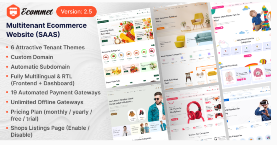 Ecommet provides vast amount of features for tenants like – 6 Themes, custom doamin, automaric subdomain, physical / digital products, unlimited product variations, stock management, flash sale, quickview, compare, wishlist, sales report, export report, orders management, advanced product search with no pageload, grid / list view, multicurrency support, multilingual & RTL frontent + dashboard, QR builder, catalog mode (enable / disable), tax, coupon, shipping methods, orders management, drag & drop menu builder, email templates, 19 automated payment gateways, unlimited offline payment gateways, cookie alert, maintenance, 404 page, google login & so much more